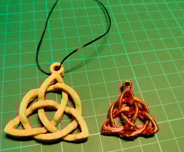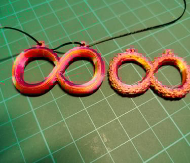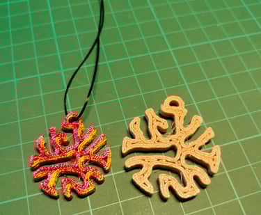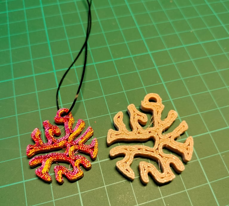 El de la derecha se ha impreso con PLA Madera y el de la izquierda con PLA ERYONE Roja, purpura y dorado.