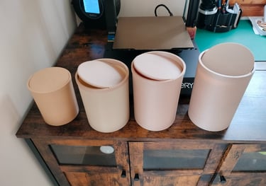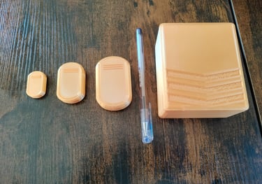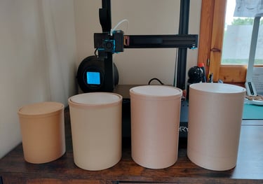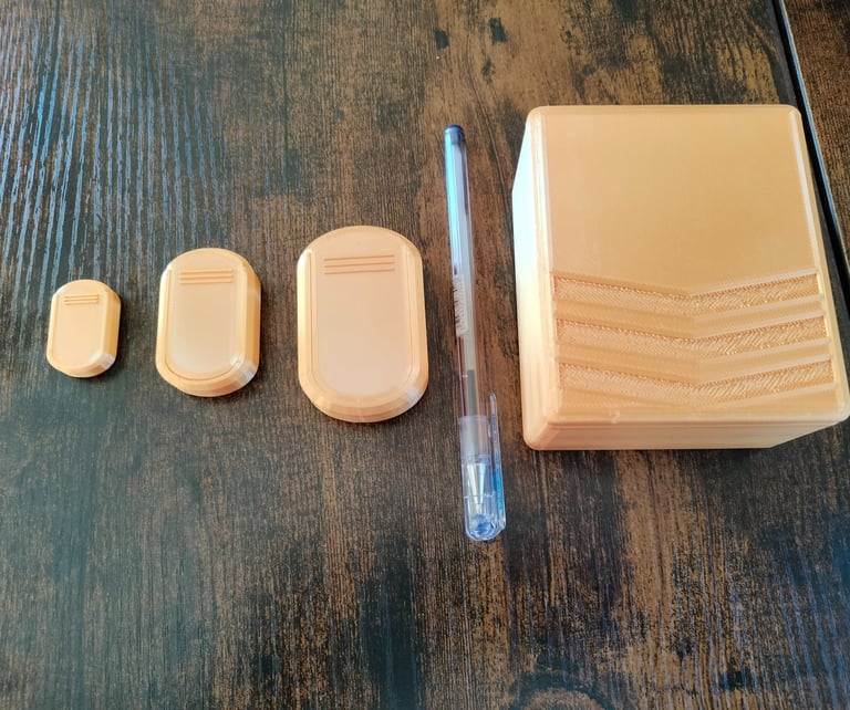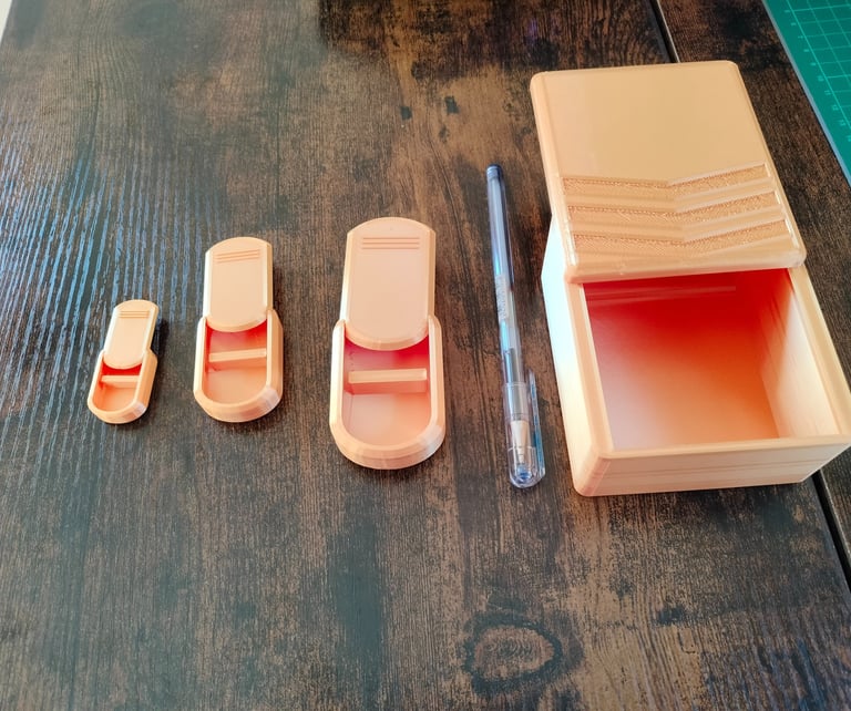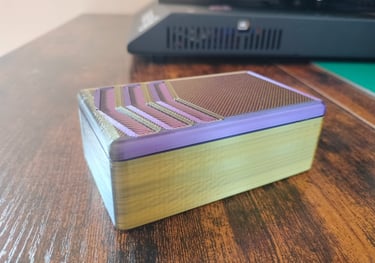 La primera caja de la derecha se ha usado PLA ERYONE tricolor Rojo, Purpura y dorado.