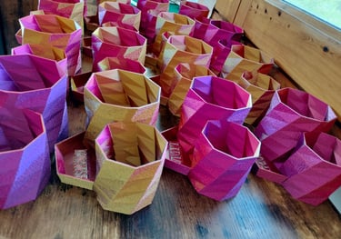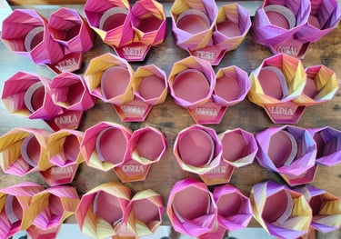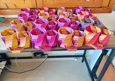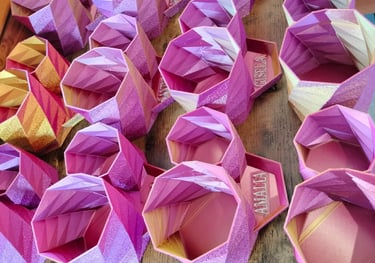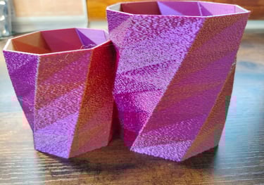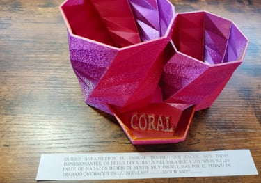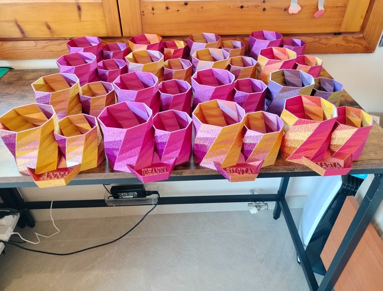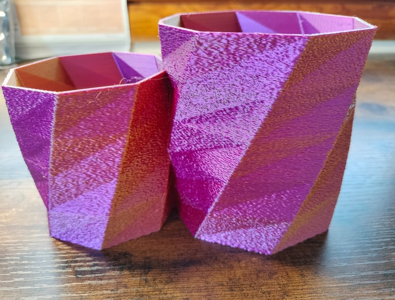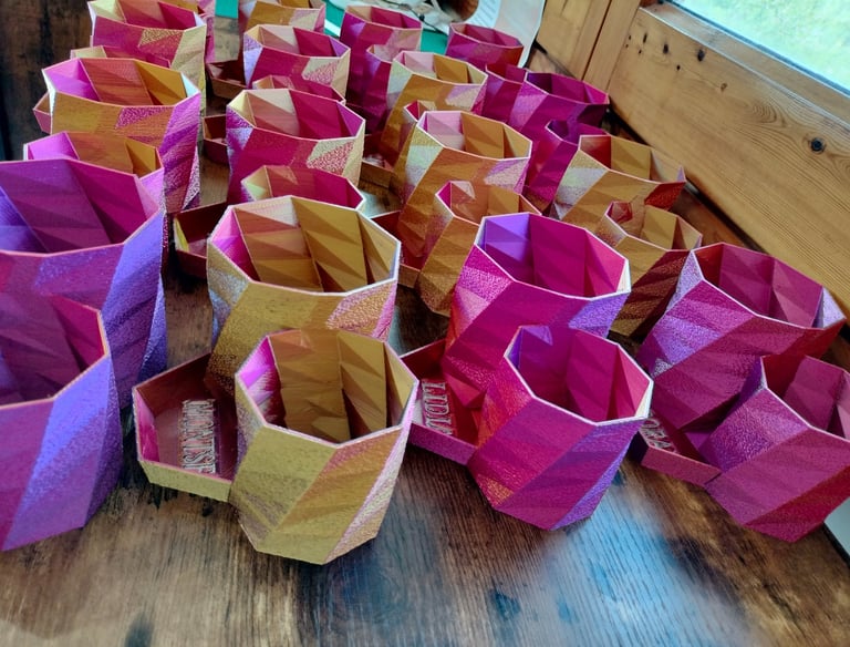 Este PLA Tricolor tiene el efecto que al girar la pieza va cambiando entre los tres colores. Por eso se ven diferentes tonos en cada pieza.